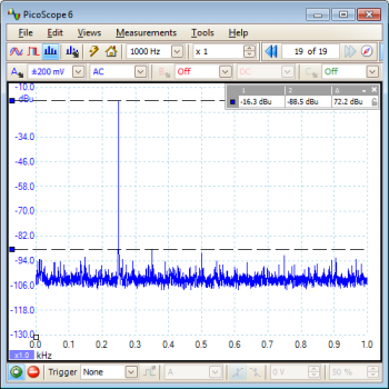 在该测试中,我们使用用PicoScope4262型示波器/音频分析仪内置得低失真信号发生器取代低成本的信号发生器。这样,我们能够测试显示在PicoScope4262前端具有具有非常低的失真所带来的好处。该发生器设置为10kHz正弦波,其幅度为990mV。