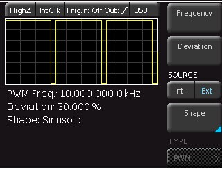 从现在开始,所有的设置都在第二台HMF上(HMF2)了。选择HMF2为脉冲功能,并且占空比设置为70%。按下MOD按钮,自动设置为PWM调制功能。现在设置频率和调制偏差为10kHz~30%。设置调制源到外部(Ext.)。在使用外部调制输入时,你可以忽略信号形状的设置。
