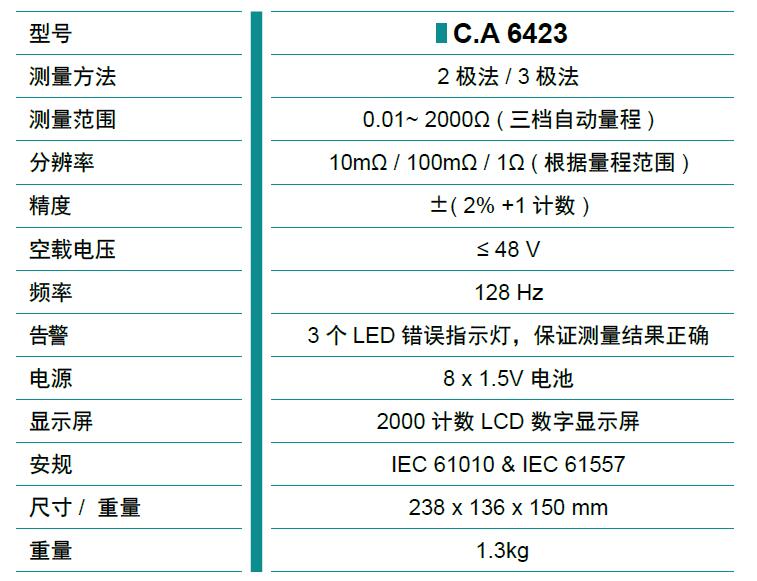 CA6423的接地电阻测量范围为10mΩ至1999Ω,带自动量程切换功能,可自动选择最佳量程档位。操作简便,只需连接测试线,按下测试按钮即可读数。大型LCD显示屏可同时指示电池低电量、超出测量范围、以及测试线错接等状态。CA6423采用3色接线端子,方便用户接线辨识。仪表面板上方有三个LED指示灯,可持续指示用户测量过程中是否出现错误,从而保证测量的精确性与可靠性。