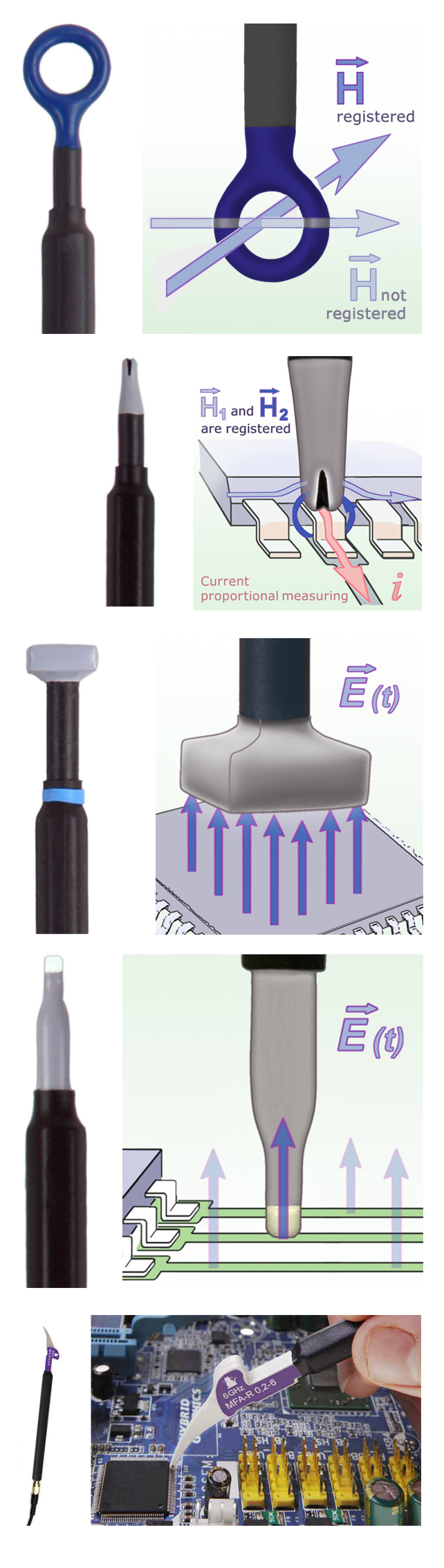 LF-R50磁场探头(100KHz-50MHz):适用于检测约3cm范围内的组装件、设备或电缆。这种磁场探头会把较大的元件识别为干扰源。 XF-U2.5-1磁场探头(30MHz-6GHz):用于选择性测量导线、SMD组件和IC引脚中的高频电流。这个探头有一个大约0.5mm宽的磁场敏感缺口,测量时将这个缺口放在布线、IC或者电容器的连接点上。 XF-E09s电场探头(30MHz-6GHz):这种近场探头可以检测受测对象(IC)耦合产生的电场。探头的侧面采用屏障设计,所以侧面作用的电场不影响测量结果。这种近场探头的灵敏度允许在0.5到10mm的距离检测集成电路及其他电子模块的电场。 XF-E10电场探头(30MHz-6GHz):用于定位最小的电场,例如0.1mm宽的导线、高针数集成电路的单个引脚等发射的电场。测试时将该电场探头放置在受测物体上。 MFA01set微型探头组(1MHz-6GHz):该探头组的分辨率高,在磁场测量方面性能优异。它可以测量频率范围在6GHz以下的磁场。如信号线、SMD-元件(0603-0201)或集成电路板的引脚。 | ![]() |