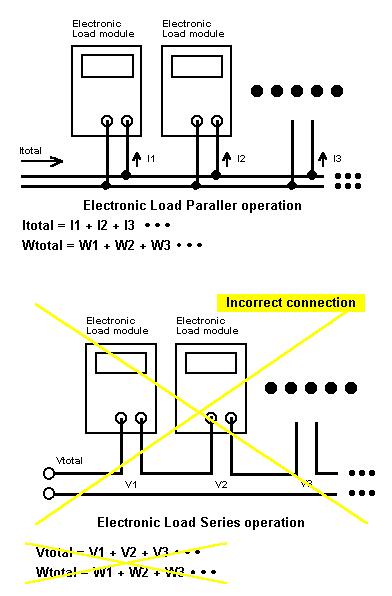 1.当电流或功率规格超过电子负载模块设定时的连接方式此时,两个或更多的负载模块可以并联起来增加其额定之规格,即使不同规格的负载模块亦可以并联起来使用,如将3310系列与3320系列并联。