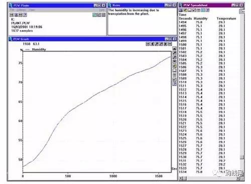 实验设置:设备下图所示设置。湿度和温度传感器连接到DrDAQ数据记录器,转而被插入PC。植物的一个分支,湿度传感器和温度传感器被放置在聚乙烯袋中,并且末端用绳子捆扎。PicoLog设置为每秒采样一次,最多1200个样本(即20分钟的数据)。图表设置为显示湿度。电子表格设置为显示湿度和温度。